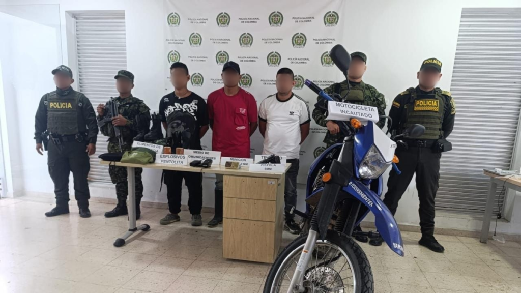 Agregó que tres personas fueron puestas a disposición de la Fiscalía General de la Nación, y durante la audiencia encaminada a legalizar la captura, se les imputaron los delitos de: tráfico, fabricación y porte de armas de fuego, uso exclusivo de indumentaria de la Fuerza Pública y recepción.