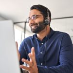 Texto alternativo: el personal de usuarios de hombres sonríe frente a una pantalla de computadora portátil con auriculares y un micrófono en la oficina.